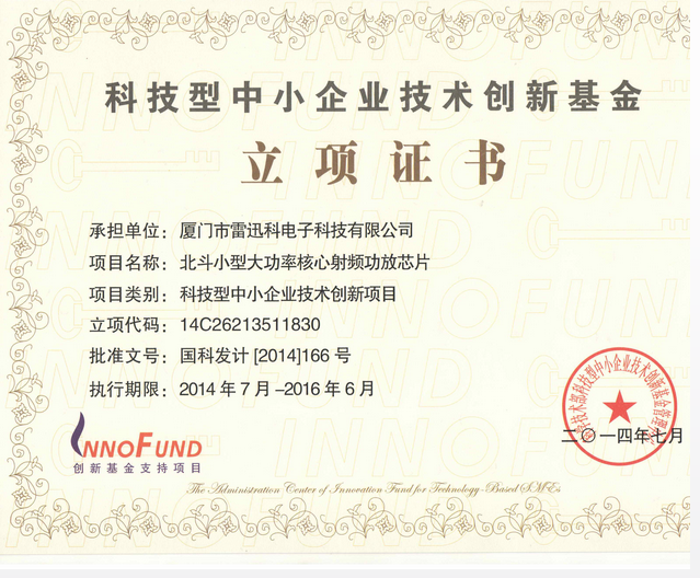 北斗芯片獲得了國家科技型中小企業(yè)技術(shù)創(chuàng)新項(xiàng)目,立項(xiàng)代碼:14C26213511830,批準(zhǔn)文號(hào):國科發(fā)計(jì)[2014]166號(hào)。