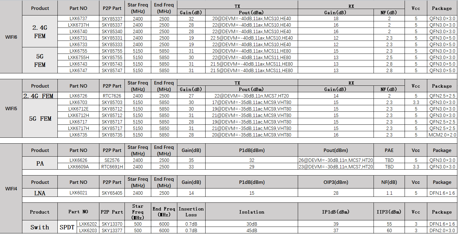 應(yīng)用于WIFI2.4G/11AX FEM,封裝Small QFN (24-pin, 3.0mm x 5.0mm)。