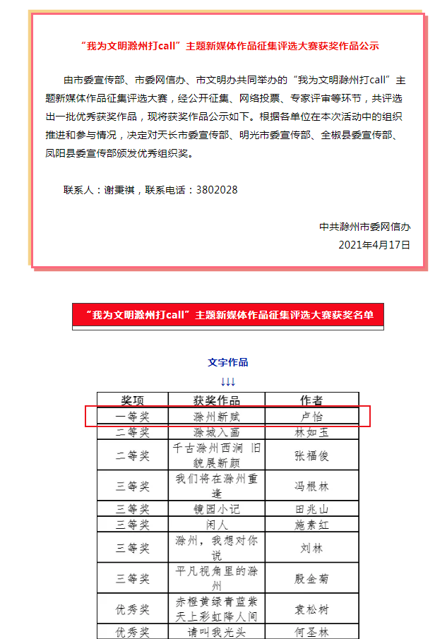 喜訊!我公司職工盧怡獲市委網(wǎng)信辦“我為文明滁州打call”主題新媒體作品征集評選大賽文字作品一等獎(jiǎng)!