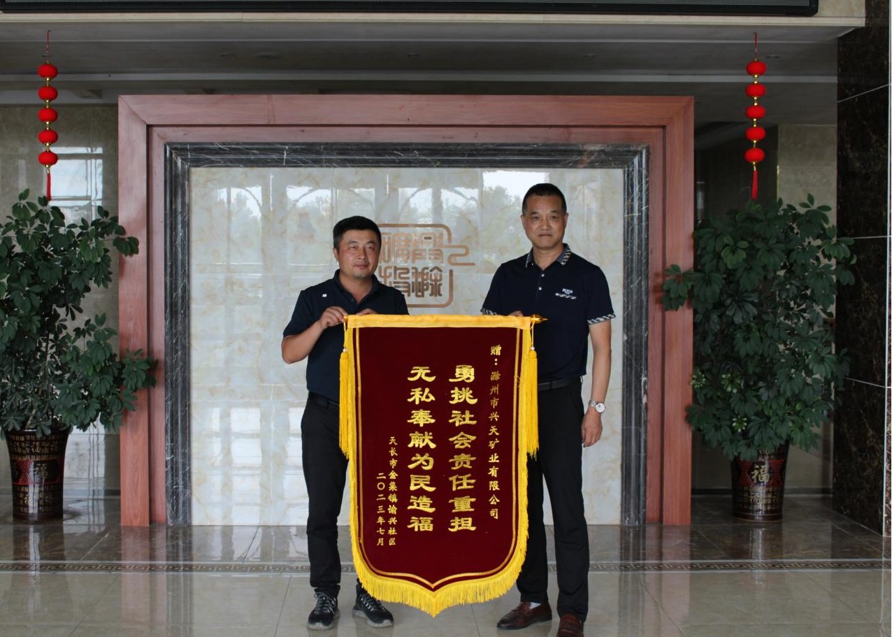 7月17日,天長(zhǎng)市金集鎮(zhèn)諭興社區(qū)將一面印有“勇挑社會(huì)責(zé)任重?fù)?dān),無(wú)私奉獻(xiàn)為民造福”的錦旗送到了興天礦業(yè)。